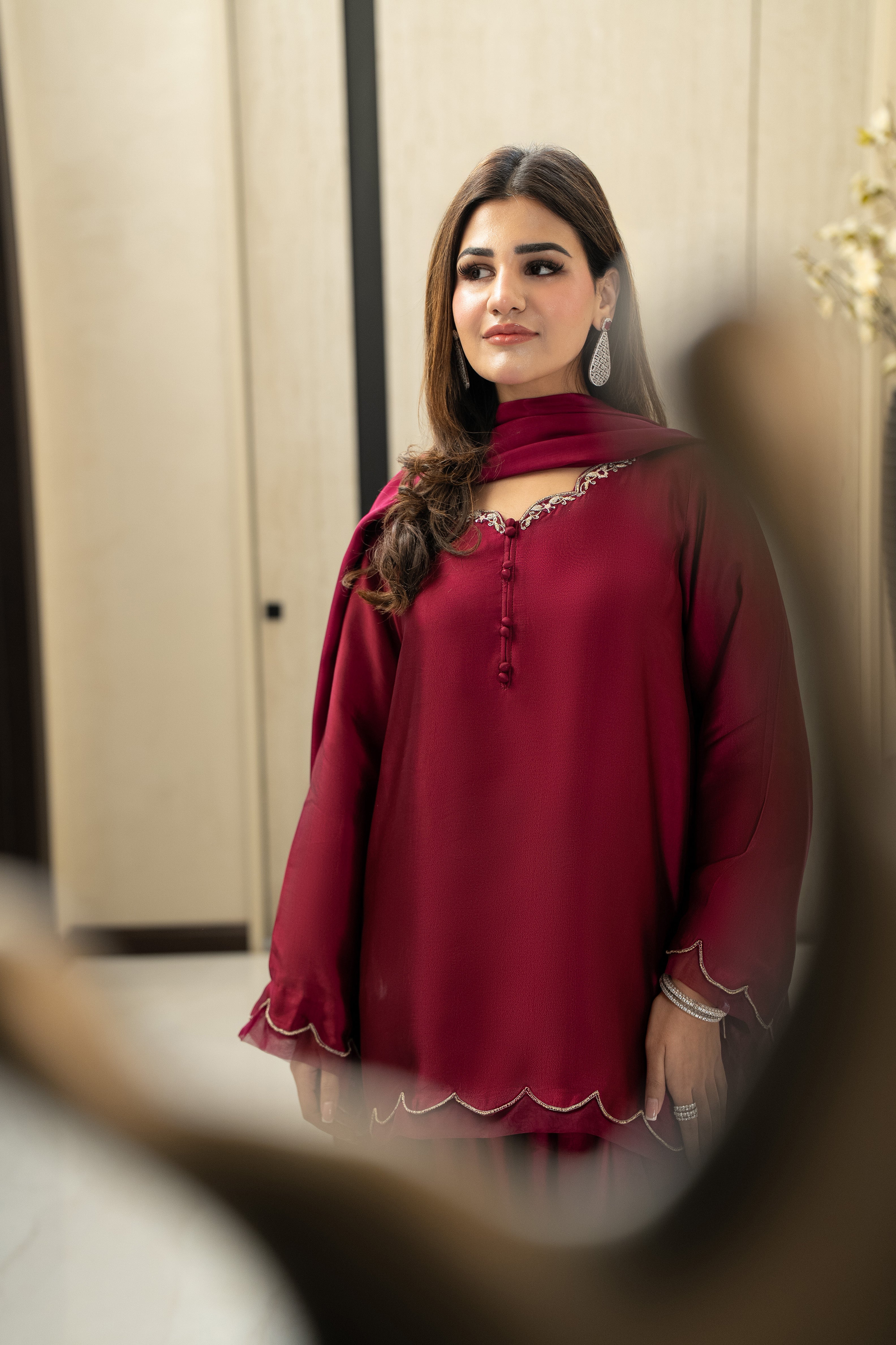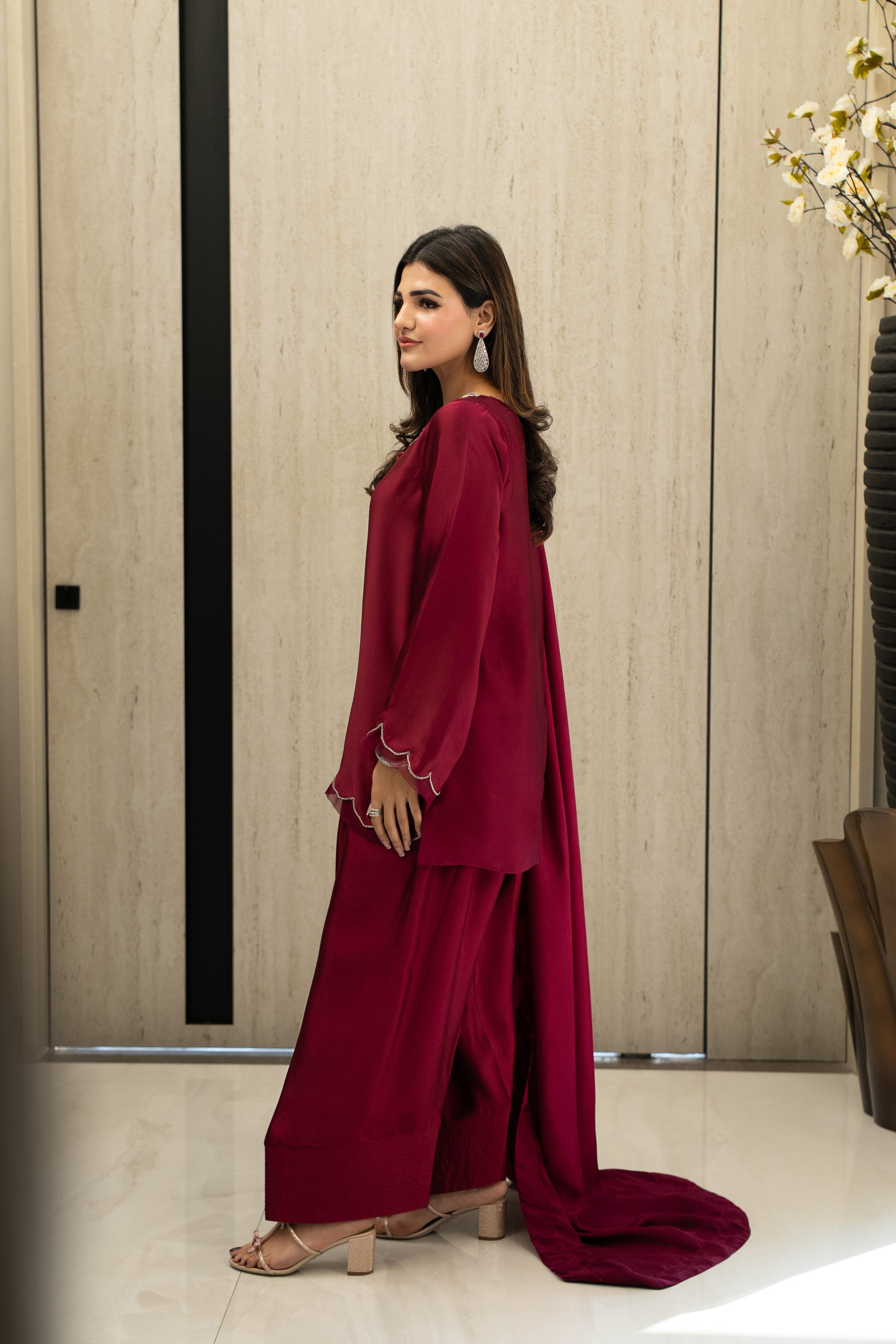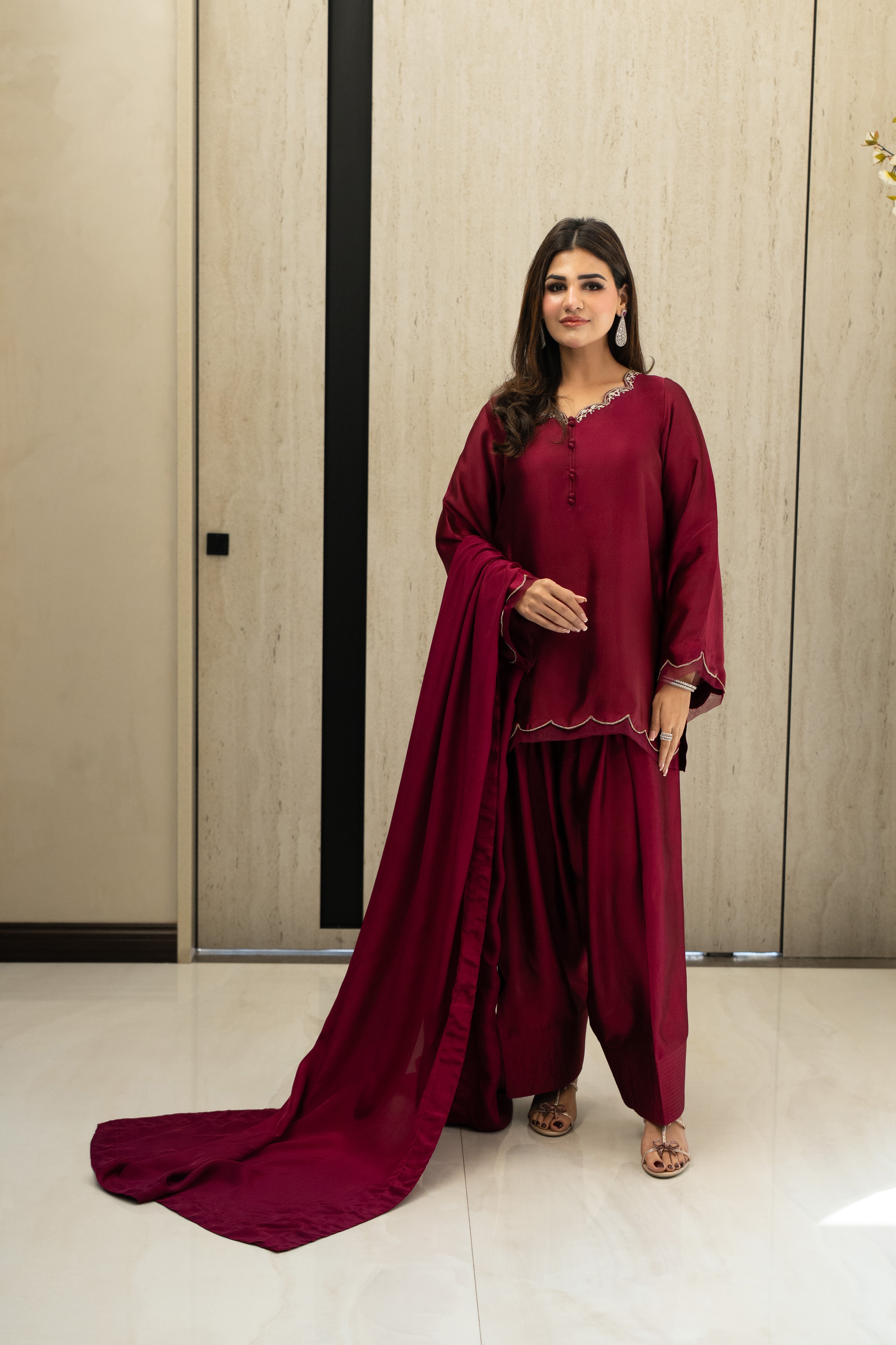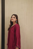 Marjan radiates a regal sophistication with its rich plum sheesha silk and meticulously hand-embroidered neckline. Featuring a modern scalloped hem and delicate organza detailing on the sleeves and border, this ensemble is designed with a farshi shalwar for a silhouette that balances traditional volume with contemporary grace. Paired with a silk dupatta, it is a luxurious statement piece crafted for the festive spirit of Eid.