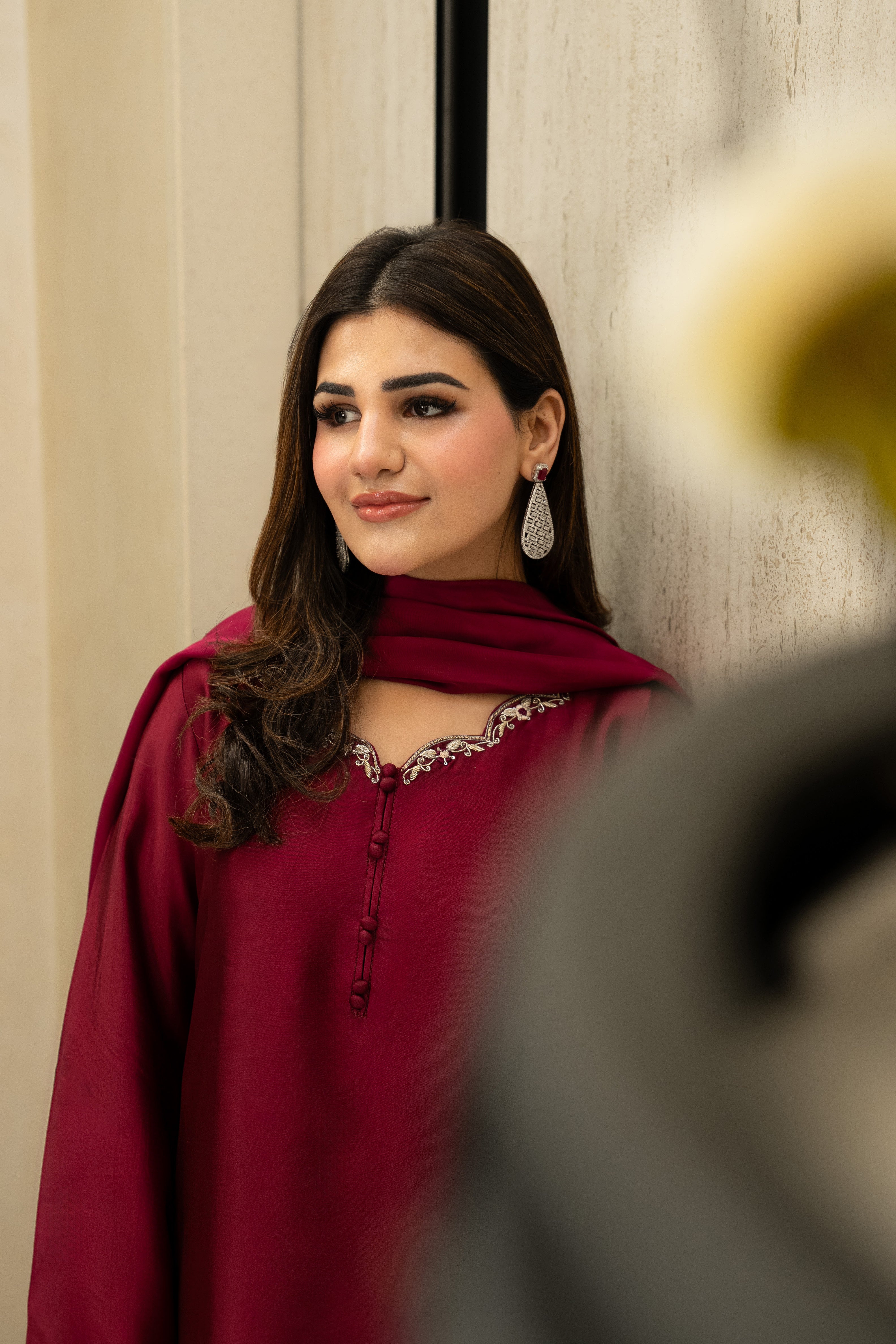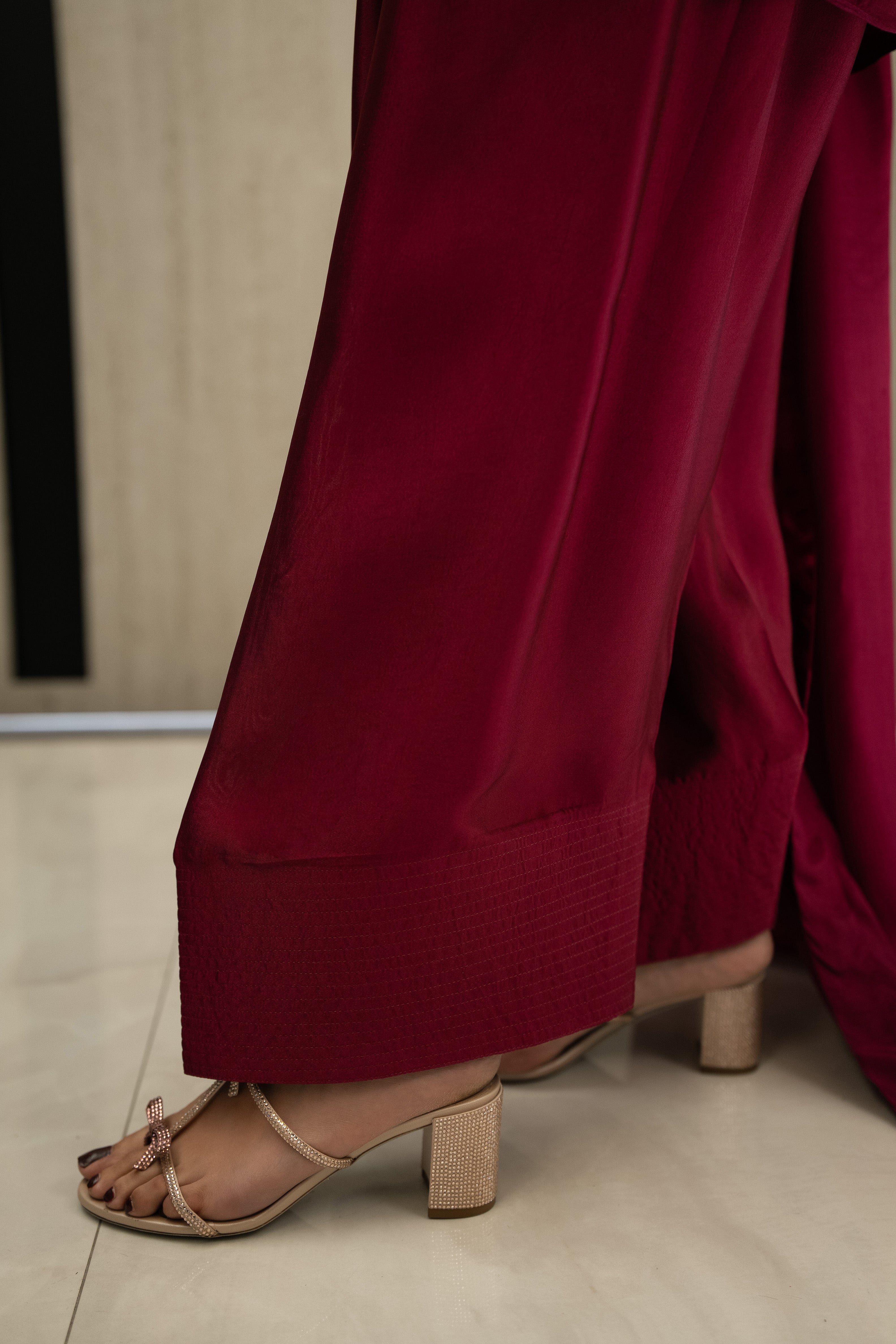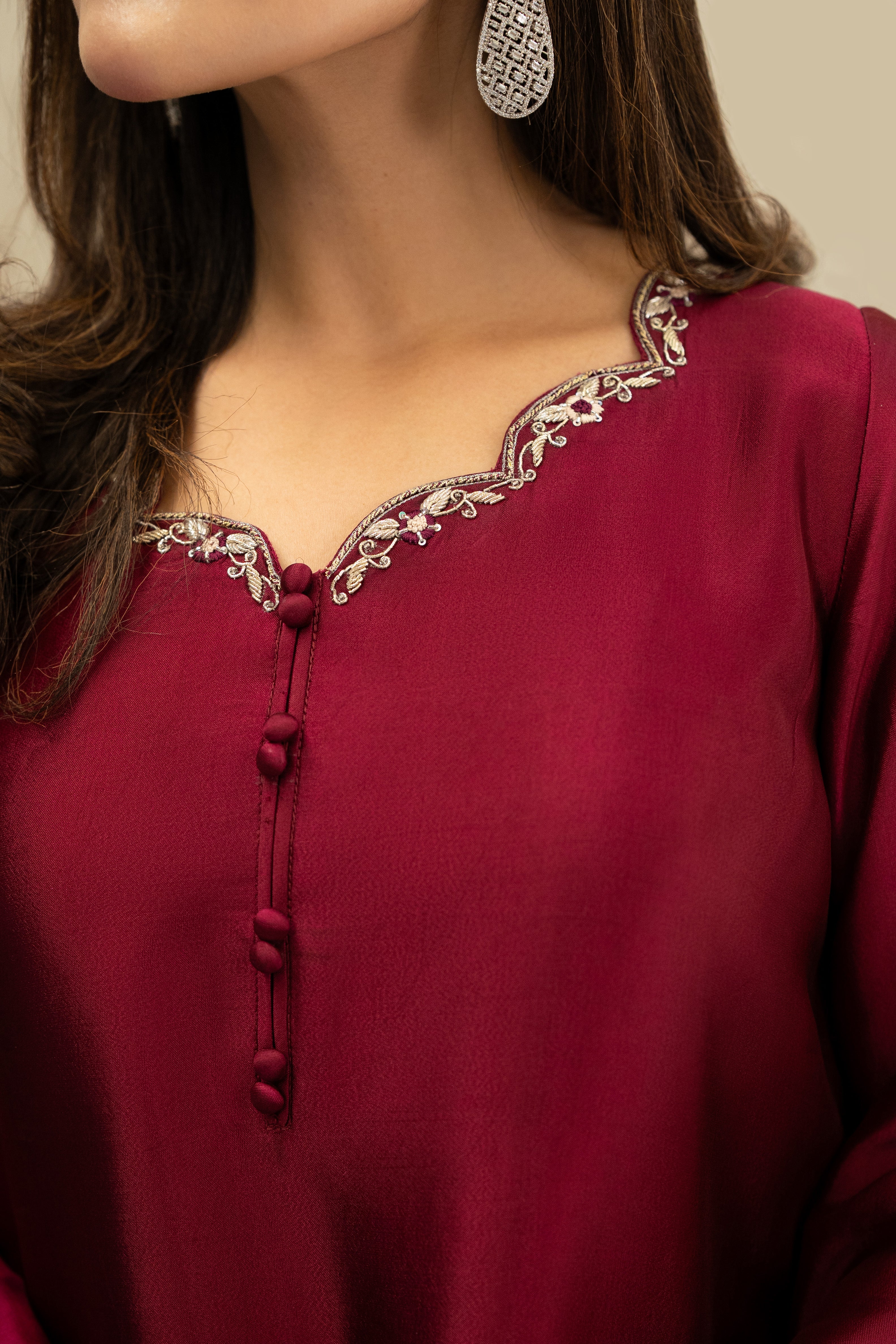 Marjan radiates a regal sophistication with its rich plum sheesha silk and meticulously hand-embroidered neckline. Featuring a modern scalloped hem and delicate organza detailing on the sleeves and border, this ensemble is designed with a farshi shalwar for a silhouette that balances traditional volume with contemporary grace. Paired with a silk dupatta, it is a luxurious statement piece crafted for the festive spirit of Eid.